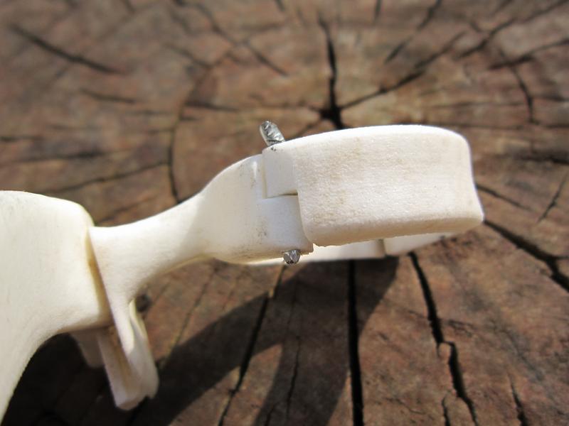 First prototype design wasn't flawless. Clamp hinge axle was only 2.5 mm in diameter and it was weakest part of entire chainguide. And after about a two months of use it broke when I've crashed my bike on steep local trail. Repair was very simple: steel nail replaced the plastic axle and tests continued.